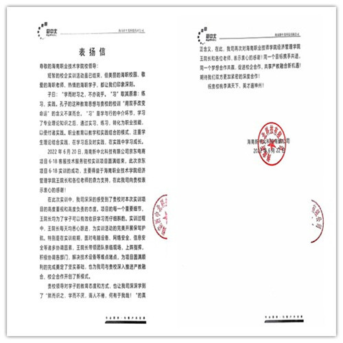 项目的圆满结束不仅展示了我校“动脑动手,尚德尚技”的育人理念,更为我校与企业深化校企合作、产教融合积累了经验,为双方合作共赢开拓了新局面。项目一结束,我校就收到了来自校企合作企业海南新中北科技有限公司发来的表扬信。信中高度表扬了我校经济管理学院对项目的圆满完成所做出的努力,期待校企双方携手共进、更加紧密深度合作,共享产教融合新机遇!
