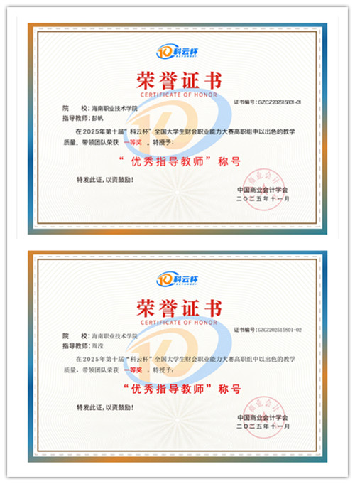 近日,2025年第十届“科云杯”全国大学生财会职业能力大赛高职组赛事圆满落幕。海南职业技术学院大数据与财务管理专业参赛团队凭借扎实的专业功底、精湛的实操能力及高效的团队协作,在全国众多参赛队伍中脱颖而出,成功斩获一等奖。指导教师彭帆、周滢因全程悉心指导成效显著,同时获评“优秀指导教师”荣誉称号。