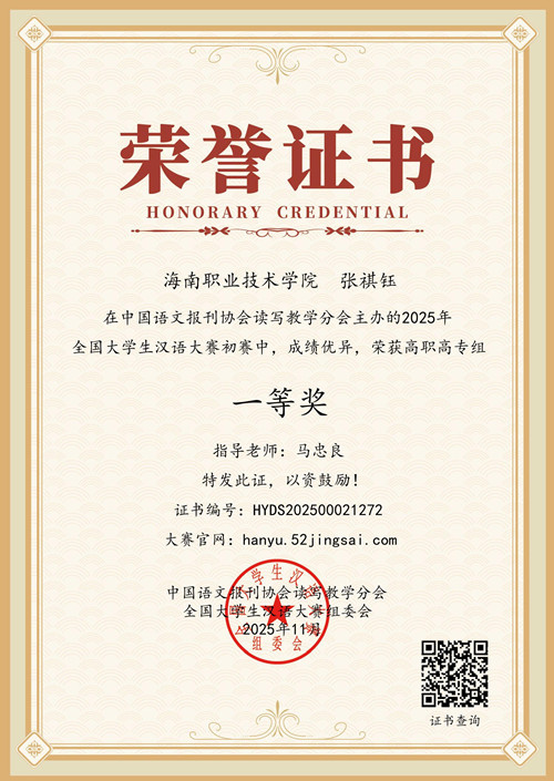 近日,2025年全国大学生汉语大赛初赛结果揭晓,海南职业技术学院张祺钰同学在比赛中表现出色,荣获高职高专组一等奖,指导老师为马忠良。该赛事由中国语文报刊协会读写教学分会主办,旨在提升大学生汉语应用能力与人文素养,吸引了全国多所高校学生参与。