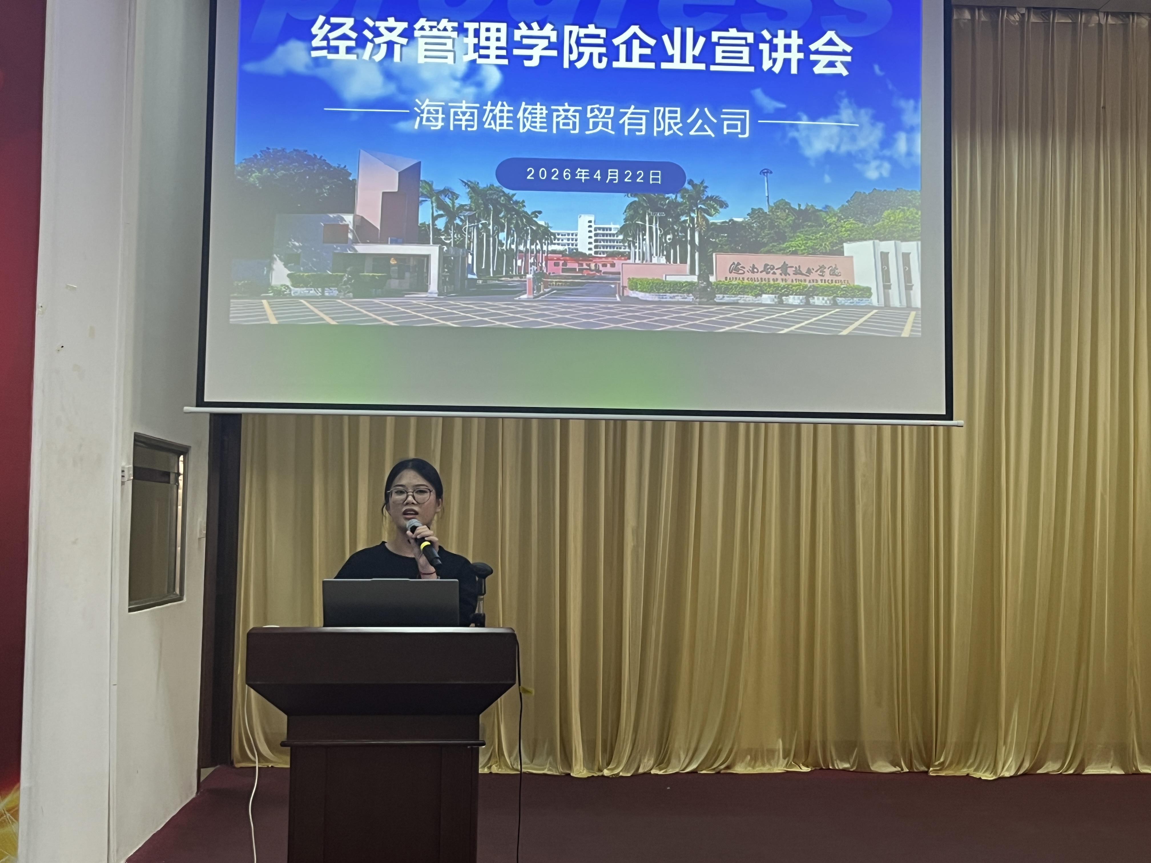 海南雄健商贸有限公司(特步)率先进行宣讲。企业HR详细介绍了公司的发展历程、企业文化,并重点解读了本次面向经济管理学院招聘的企业管培生岗位需求。从初入职场的适应阶段,到逐步成长为区域管理骨干,公司清晰的职业晋升路径引起了同学们的浓厚兴趣。在随后的互动环节,学生们围绕薪资结构、培训体系、晋升考核标准等问题踊跃提问,HR逐一耐心解答,现场掌声此起彼伏。