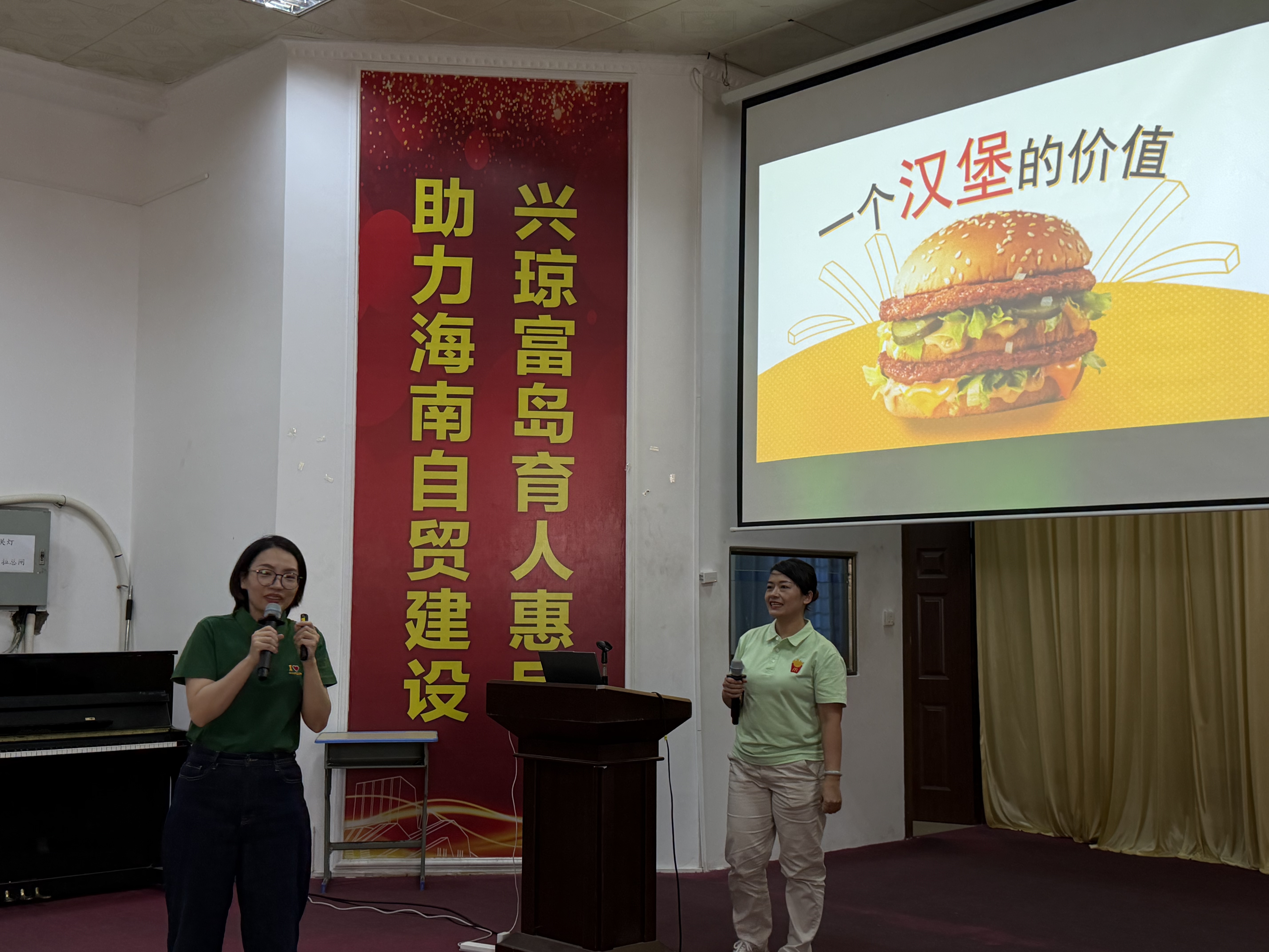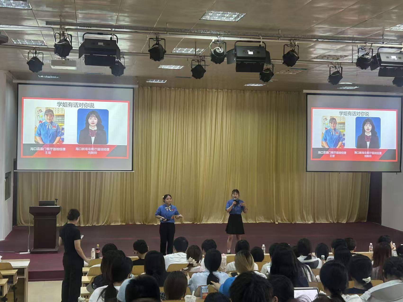 在会议下半场,海南银达国际餐饮管理有限公司(麦当劳)带来了一场别开生面的分享。往届学姐刘新玲和王容随企业代表一同返校,结合自身在麦当劳工作的真实经历,讲述了从校园走向职场的点滴体会。刘新玲分享了如何在快节奏的工作中提升沟通与执行能力,王容则介绍了门店管理岗位的成长路径和职业收获。两位学姐的真诚发言拉近了企业与学生之间的距离。在随后的互动环节中,同学们就工作时间、晋升机会、企业文化等问题与学姐及企业HR进行了深入交流,现场气氛轻松活跃。